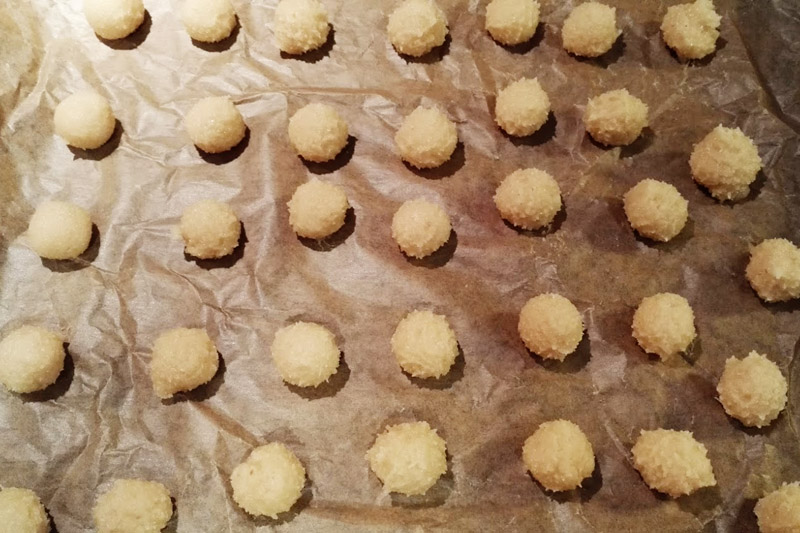 Eiweiß dazugeben, mit Mehl und Puderzucker verkneten.