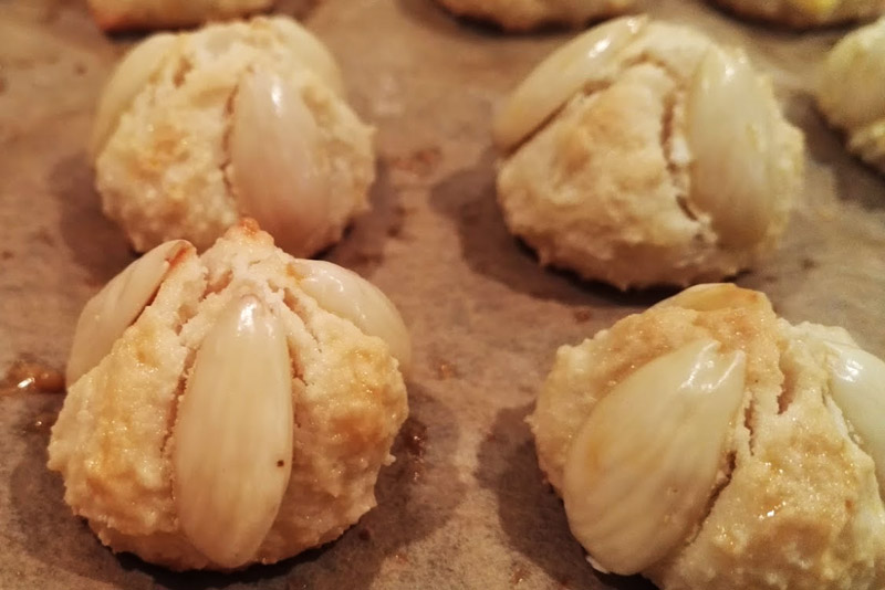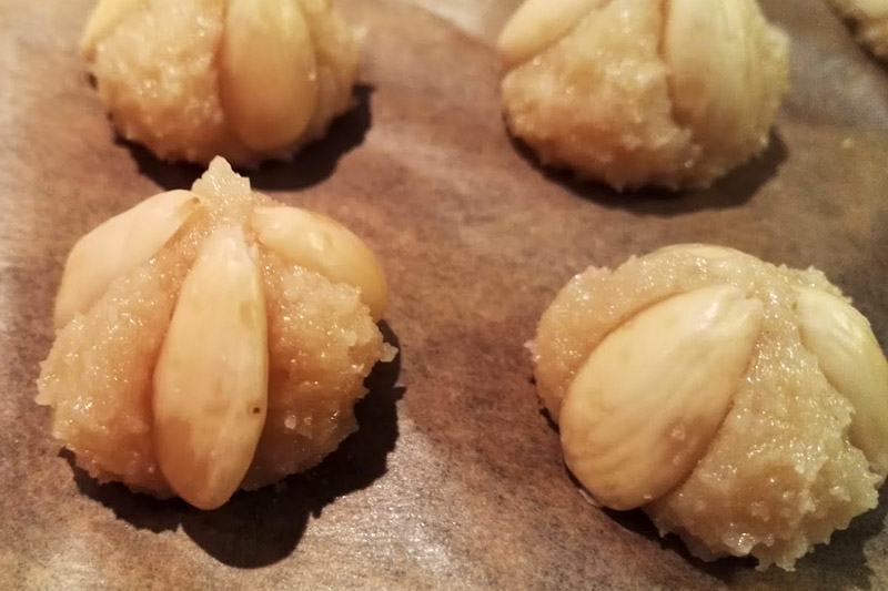 Kleine Kugeln formen und mit jeweils 3 halben Mandeln verzieren.