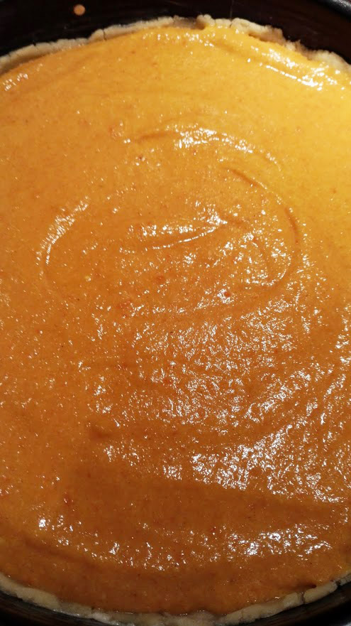 Den Mürbteil auswellen und mit einem 3-4cm hohen Rand (je nach Kürbismenge) in eine gefettete (Butter) Springform oder Tarte-Form einpassen und einstechen. Dann die Kürbisfüllung darauf geben.
