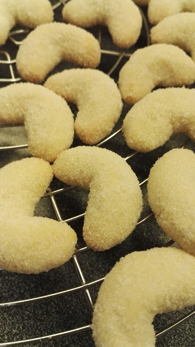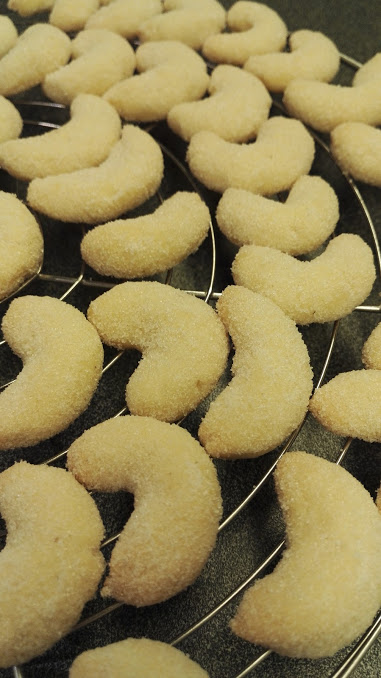 Mehl, Butter, Zucker, Mandeln und 1 Pächchen Vanillinzucker verkneten. Hörnchen formen und bei 180° C ca. 7-10 Minuten backen.