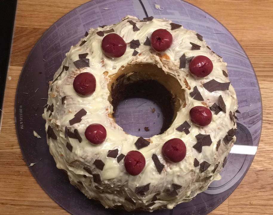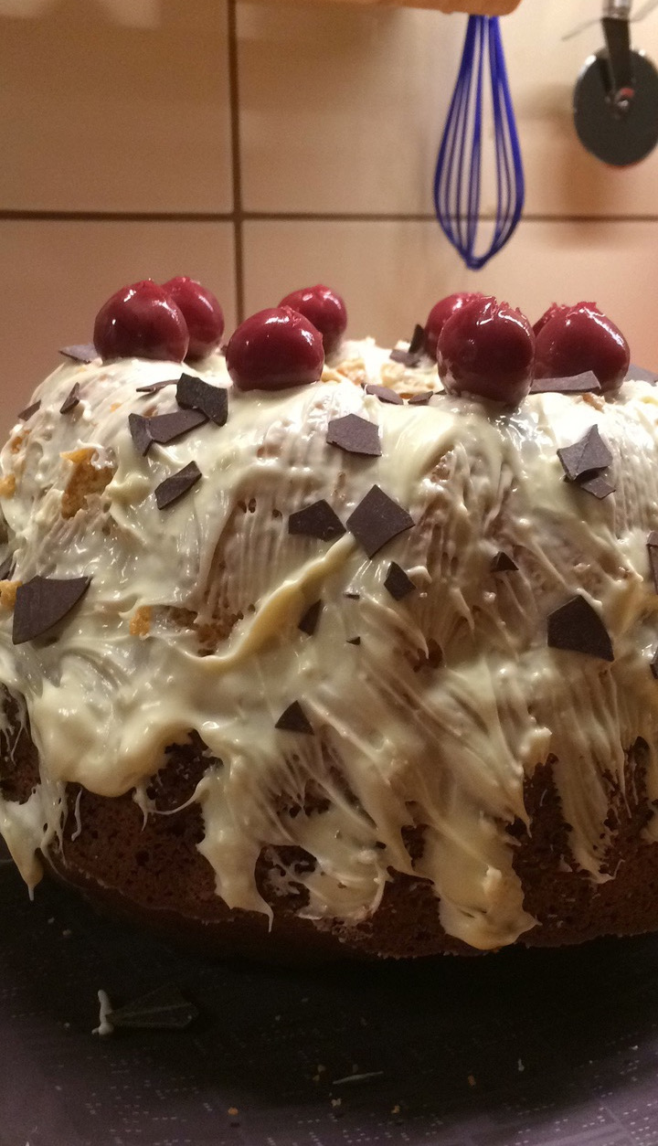 Auf mittlerer Schiene im Ofen 50 Minuten backen. Kuchen komplett auskühlen lassen und erst dann stürzen (wenn der Kuchen warm ist und gestürzt wird, zerfällt er, weil die Kirschen recht feucht sind).